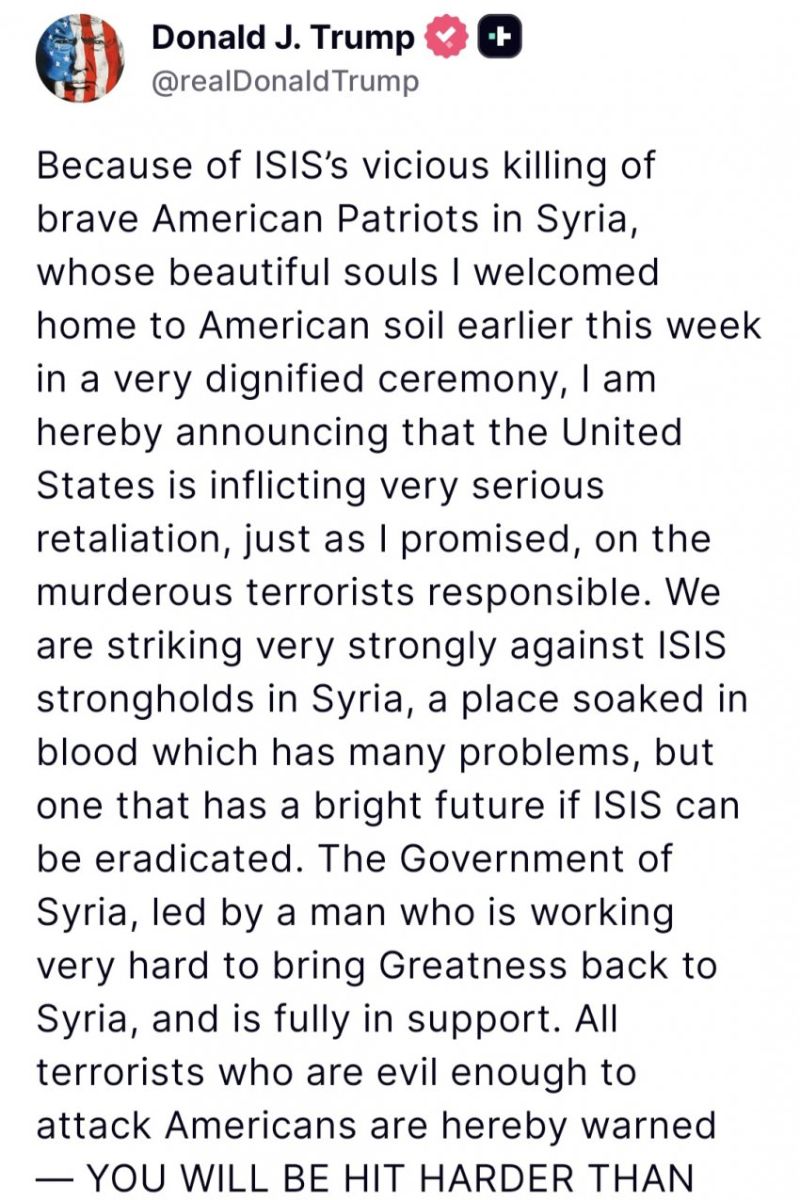 ISIS가 시리아에서 용감한 미국 애국자들을 잔인하게 살해한 사건 때문에—그들의 아름다운 영혼을 이번 주 초 매우 엄숙한 의식으로 미국 땅에 맞이했던—나는 여기서 약속했던 대로, 그 살인적인 테러리스트들에게 매우 강력한 보복을 가하고 있음을 발표합니다. 우리는 시리아 내 ISIS 거점들을 매우 강력하게 타격하고 있습니다. 그곳은 피로 물든 곳으로 많은 문제가 있지만, ISIS가 근절된다면 밝은 미래를 가질 수 있는 곳입니다. 시리아 정부는 시리아에 다시 위대함을 가져오기 위해 매우 열심히 일하고 있는 한 지도자가 이끌고 있으며, 이 작전을 전적으로 지지하고 있습니다. 미국인을 공격할 만큼 악한 모든 테러리스트들에게 경고합니다 — 만약 당신들이 어떤 방식으로든 미국을 공격하거나 위협한다면, 지금까지 받아본 것보다 훨씬 더 강하게 타격을 받게 될 것입니다.도널드 J. 트럼프